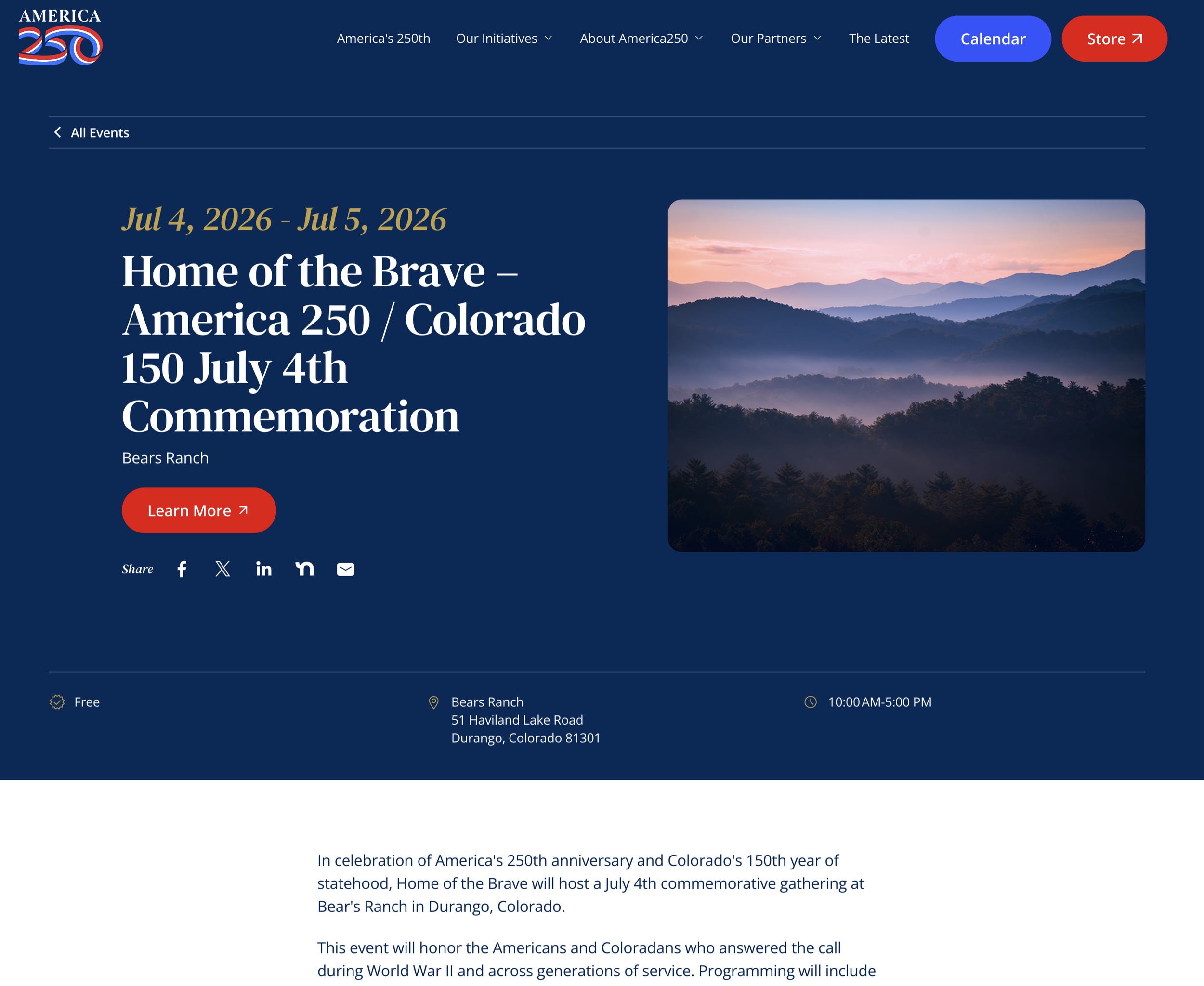 Join us this July 4th and 5th as we gather for the Home of the Brave America 250 / Colorado 150 Commemoration.